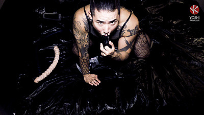 Lubricating a series of erotic toy devices in varied sizes, subject licks them in preparation and thrusts them deep into his rectum, one or sometimes two at a time. Both his male and pseudo-female anal genitals work in tandem to produce a heightened sexual sensation and eventual spasmodic release. Subject's caged and restrained cock unleashes a stream of urine that he scoops into his palm and ingests orally.