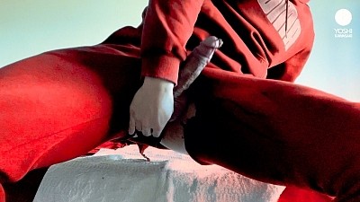 The erect subject withdraws the dildo and leaves the pussy gaping. He's uncontrollably horny and ejaculates into his hand. Smoothing sperm onto the dildo he uses it to fuck himself. One ejaculation was hardly enough for the horned-up Yoshi. He's still rock hard. 6 months without wrecking his hole was definitely too long for him. The subject plugs up his gaping hole and walks out of his room. He takes the action out to the corridor of his apartment building. Yoshi carefully checks no one is there to observe his erection and torn pants. Playing in front of the elevator he cums again, finally able to master his sexual urges.