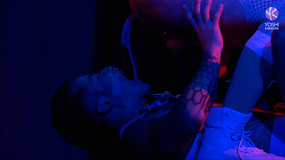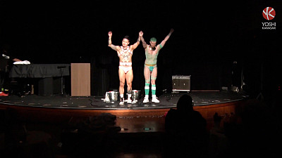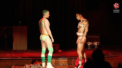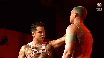 The atmosphere crackles in a crowded Asian nightclub. Two warriors clad as game characters take the stage, ready for a display of bare-knuckled combat. Epic music pulsates through the crowd. But Yoshi and Axel Abysse are here with fists raised, not as instruments of violence, but of passion. They drop their cloaks and circle each other warily. Once their hands reach out to grab each other's muscular chests, they lock into a deep kiss and prepare for their battle.