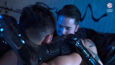 Yoshi's making out with muscleman Reach, both in shiny black latex full-length gloves and knee-high socks. Their socks and gloves are oiled-up and give off a glossy luster. Two horny rubber pigs get off on feeling each others' bodies through the slick latex gear. Yoshi sucks Reach's thick nipples and then his swollen cock, deep throating the long stiff tool.