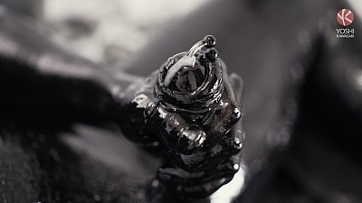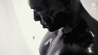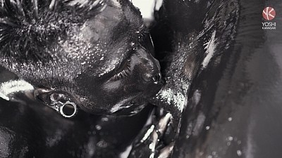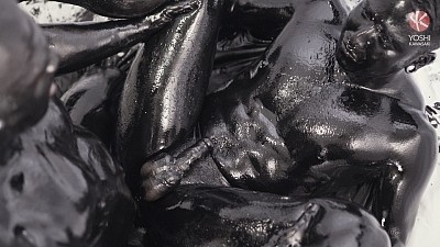 Preparing for a wet, sticky scene, inked up Asian muscle daddy Damian Dragon and his tatted son Yoshi splatter a thick coat of oily black goo over their heads, soon coating their entire bodies in shiny black gunge. Hands reach down to jerk each other's swelling tools, and Damian chews on the ring through Yoshi's gleaming black nipple.