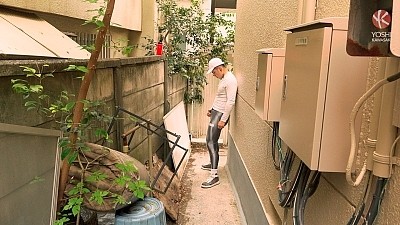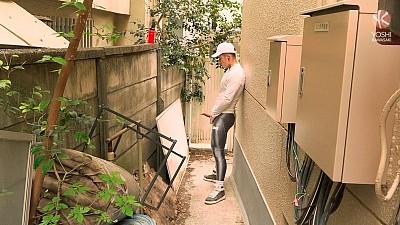 Yoshi takes a stroll, looking for another exciting outdoor wank. He finds a suitable spot behind a fence to revel in the risk of being discovered. He’s clad in tight, revealing spandex leggings and a shirt. His rock hard cock bulges through the very smooth, clingy leggings. Yoshi lubes up his fierce bulge to make it even more visible. While tweaking his nipples, his dick twitches. He jerks off just behind the fence where people walk by, blasting his big load on the ground.