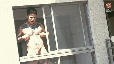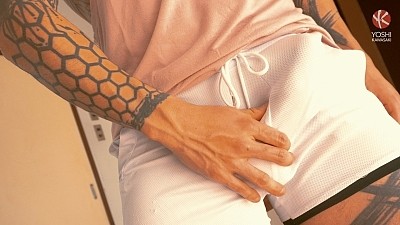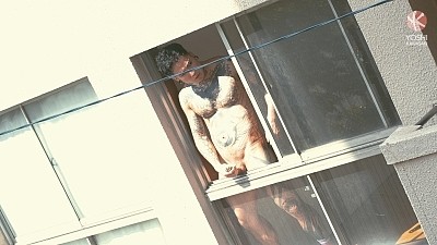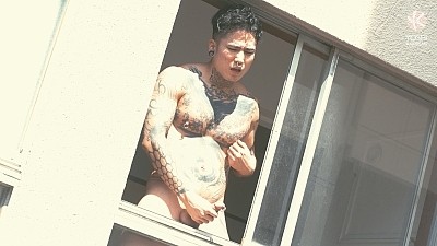 Yoshi and his cameraman sneak around to find a vacant room in a nearby apartment. The door is unlocked so they enter the room, hoping there’s no one in there. Inside, the big window faces a backstreet. Yoshi’s dick is already rock hard from this bit of forbidden activity, he knows what he wants to do there. He rubs his stiff cock as it swells inside his white shorts. He's already leaking precum. Yoshi spits on his stiff tool and gets naked. He steps onto the balcony, thrilled by the risk of getting caught. Stroking his dick for public view, he suddenly starts pissing himself. He climbs onto the railing. When he sees someone walking past, he hurries inside. Squatting next to the window he keeps jerking off, exposing his naked butt to the world. He presses his hard body against the window, shows off his raging pierced dick. Feeling bolder again, he cautiously opens the window and starts beating his meat. As he touches his nipples, his throbbing dick pulses. Yoshi stands on the window stool and shows off his naked body till someone passes and scares him back inside. Sitting next to the window he continues jerking off, reaches his final ecstasy out on the balcony.